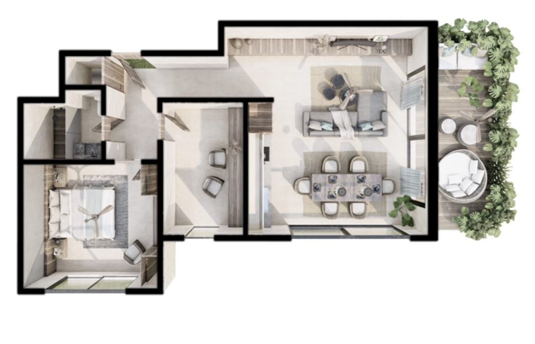 Tierra features a spacious bedroom fitted with a king-sized bed, along with a well-appointed bathroom that includes a walk-in shower, a separate vanity, and a private toilet area, creating comfort and functionality for everyday living. Distinct in layout from the Viento unit, Tierra also boasts a large private balcony, an inviting outdoor living space offering unobstructed sunset views over the lagoon and mountains. Residents enjoy full access to the shared rooftop, where breath-taking sunsets and moonrises over both the sea and lagoon create an unforgettable backdrop.