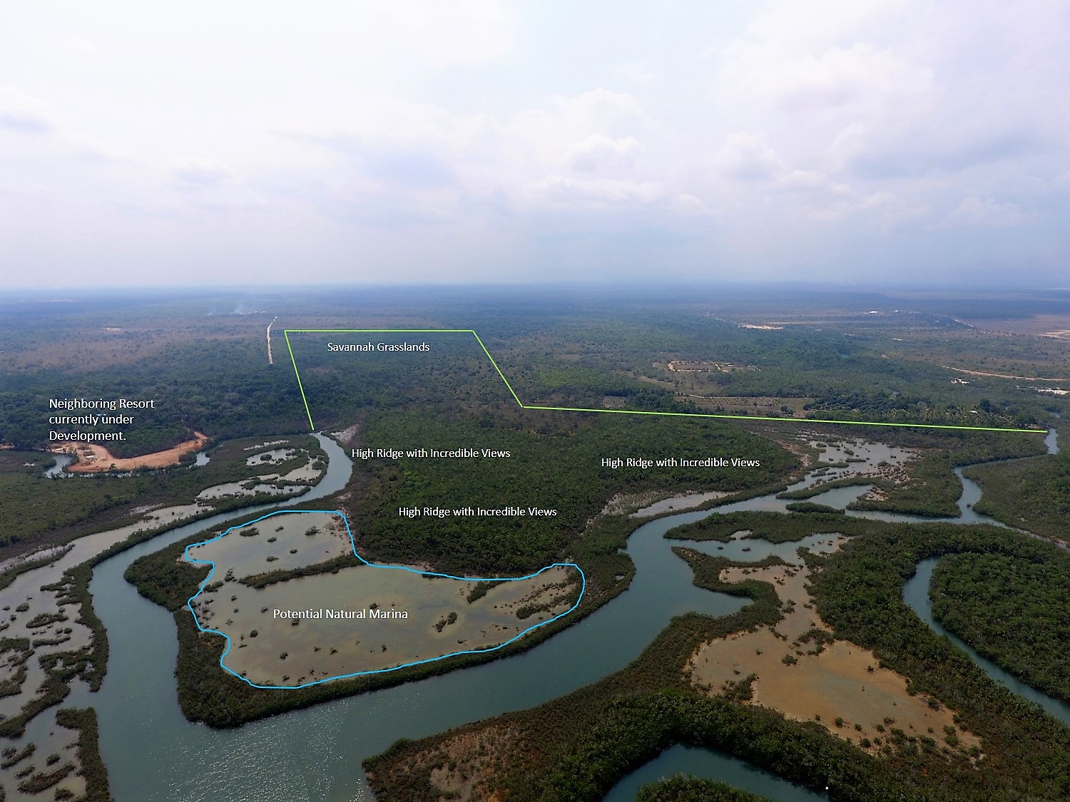 This remarkable 100 acre development site boasts nearly a mile of waterfront along the famous Hokey Pokey Water Taxi Station. The elevated dry land on the high ridge offers stunning views of the water and extends down to Mango Creek.